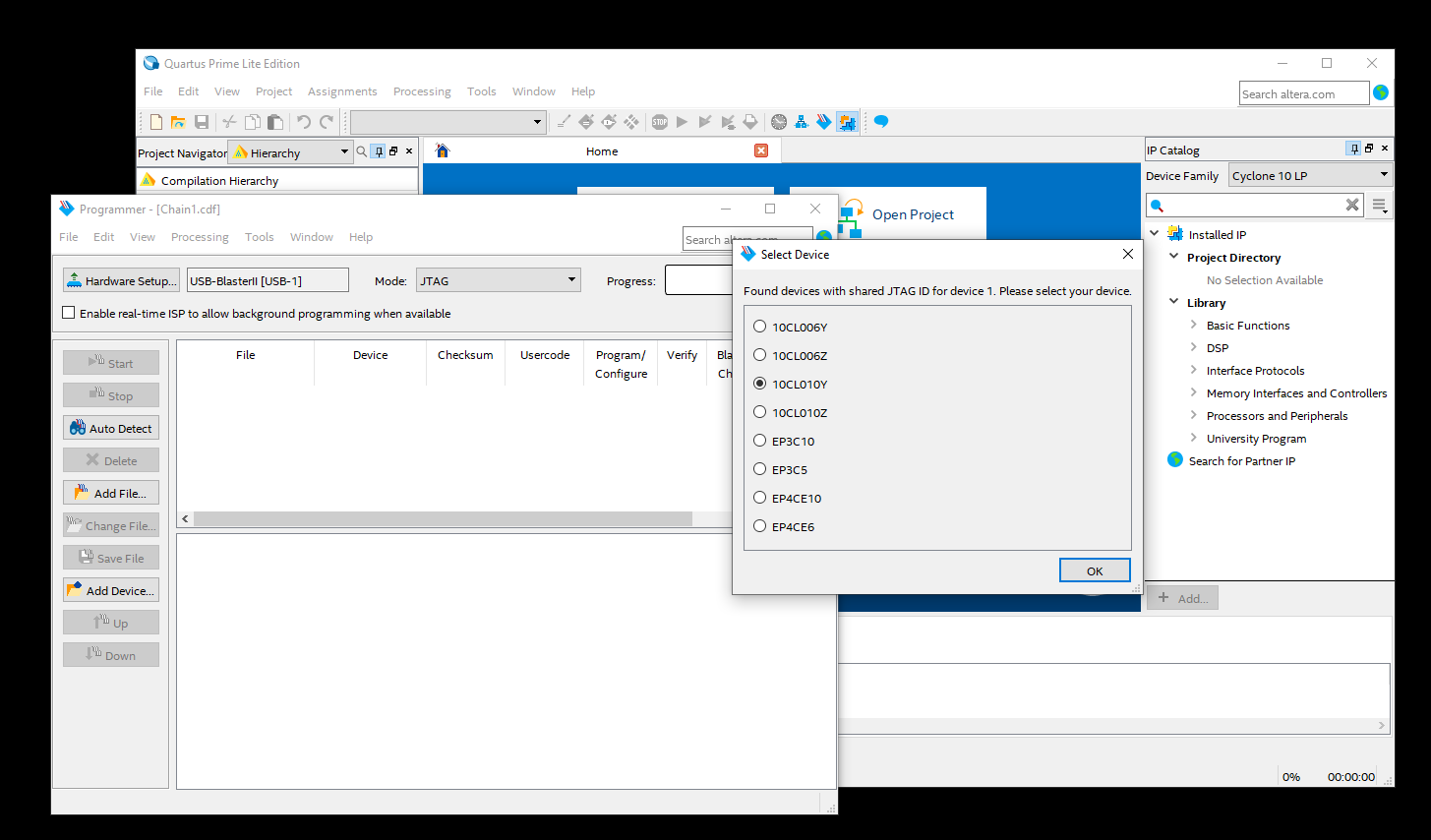 Note that, on another board with Arria V GZ device (5AGZME3E3), the programmer is working fine. Also note that, yesterday morning, I was able to program the 10CL010YE144A7G device that I am currently having problems.