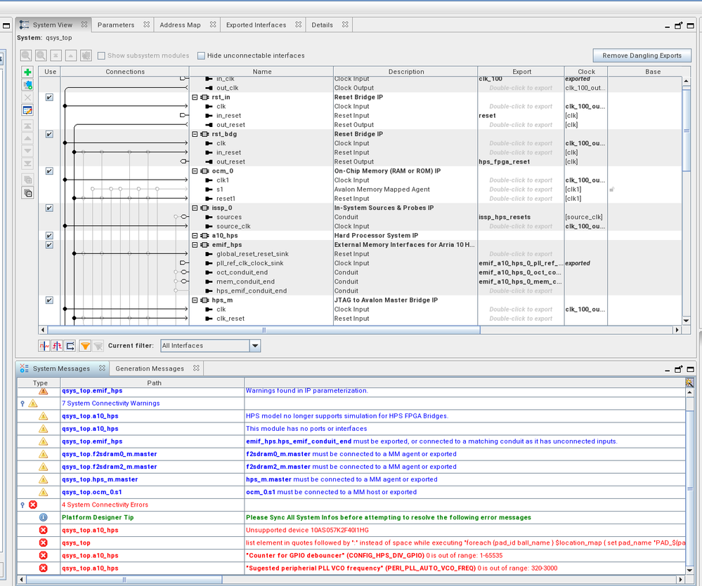 - The Arria 10 device is flagged as deprecated in the Standard version; IP core generation fails in Pro edition as well.