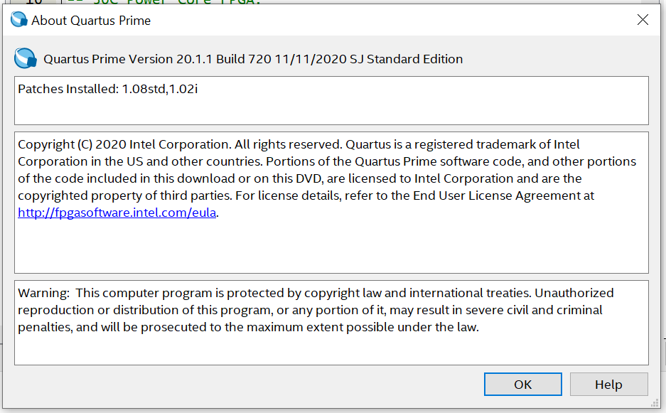 I am using Quartus Prime Standard Edition 20.1.1 Build 720 with Patches Installed 1.08std, 1.02i running on Windows 10 primarily but also on Ubuntu.