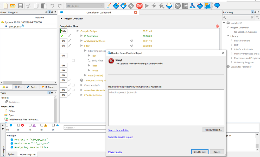 Every time I attempt to compile this project the progress bar reaches 16% and then quartus crashes on the info message "Analyzing source files" with no additional errors.