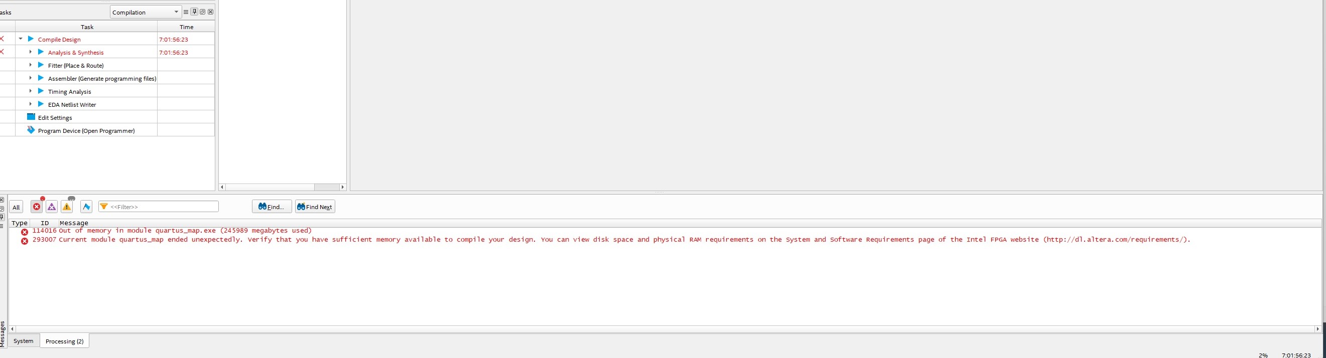 I have Quartus Prime Lite v. 21.1. I have a very large design that won't compile and exits (crashes) after 50 hours of compilation due to out of memory. I have listed to use 8 processors out of the 16 logical cores I have with my current CPU, and list the max memory of 16GB, of which I have 128 GB ram installed for my AMD Ryzen 9 7950x3D.