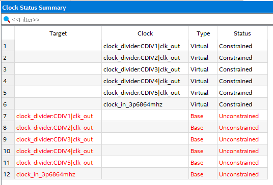 For the slowest 2 clocks, I just used 10kHz, they are actually slower. In the Timing analyzer, I tried to define the clock divider outputs as generated clocks. But these constraints were rejected and not saved to the SDC file.