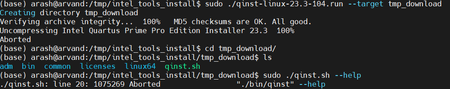 Hi I am trying to install Quartus 23.3 on my linux machine. It uses Intel I9 processor and the OS is Ubuntuo 22.04.4 LTS "Aborted" message keeps showing up and I don't have any clue how to proceed....