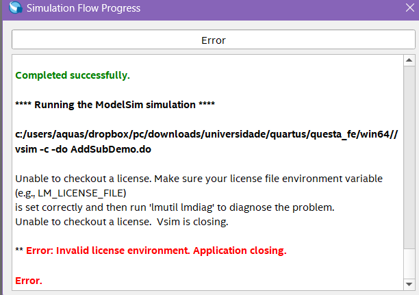 After setting up the license and configuring the environment variables, including adding the license file path to the environment variable and the License Setup in Quartus, I still receive an error when attempting to run a simulation (Error: Invalid license environment. Application closing.").