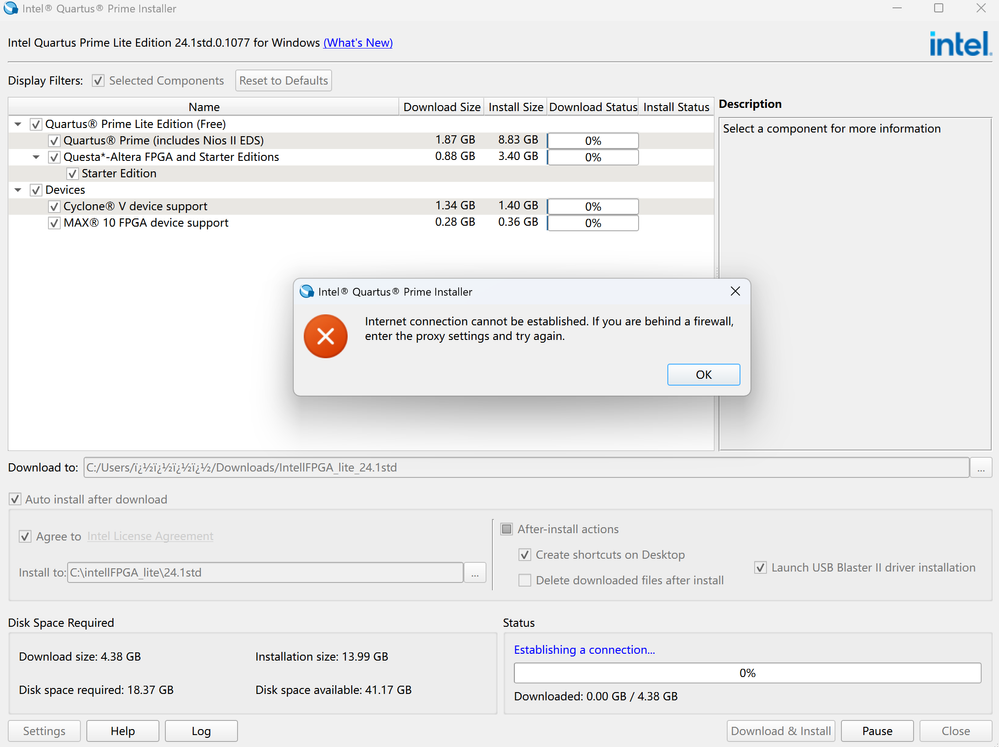 I am encountering an issue during the installation of Intel® Quartus® Prime software, where the installer fails with the error: "Internet connection cannot be established." As shown in the attached screenshot, this prevents the download and installation process from proceeding.