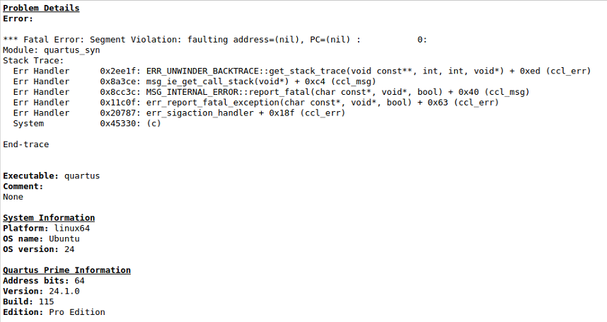 I am working with Quartus Prime Pro 24.1. Unfortunately, I have encountered several issues when compiling my project on different machines and operating systems. While the project compiles and builds the bitstream without any problems on Windows Server 10, I receive a fatal error on Windows 11 and Ubuntu 24 for the same design, at the "support-logic Generation" phase. All machines are relatively powerful and equipped with more than 32 GB of RAM. I have also disabled parallel compilation, but the error still occurs. Additionally, I tested Quartus 24.3.1 and observed the same behavior.