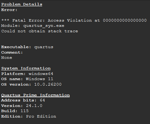 Quartus Prim Pro: "Fatal Error: Segment Violation, Access Violation"