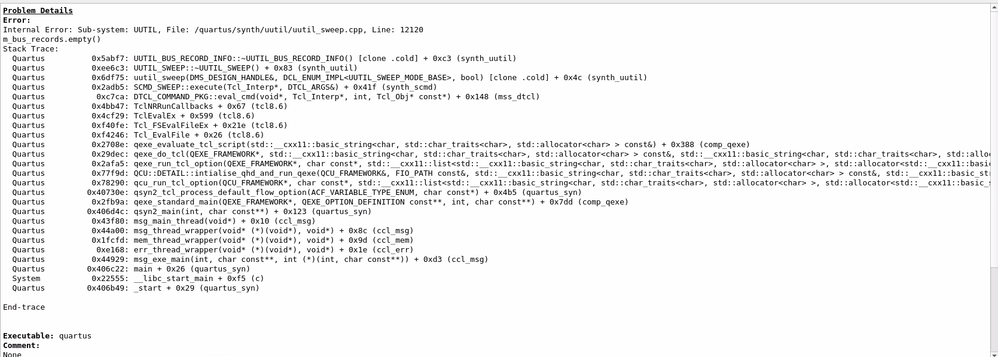 I am using quartus prime pro 24.1 and the tool crashees during the synthesis and analysis phase, please see the attached logs. Can anyone help find/solve this issue?