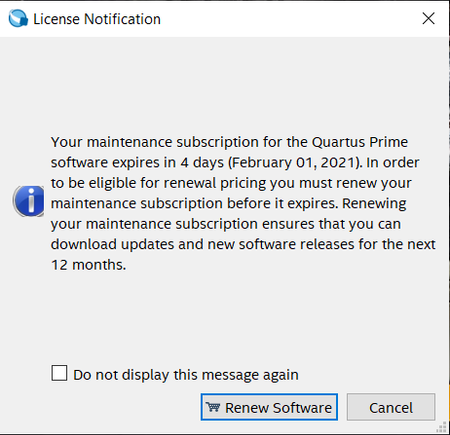 Welcome to INTEL forum. The Quartus Lite Edition software requires no license, so it will continue working even after maintenance subscription expires. This is the normal behavior of the Lite Edition software and you can ignore the message. Please continue with the compilations and report to us back if the compilation is not successful with error message in Quartus.