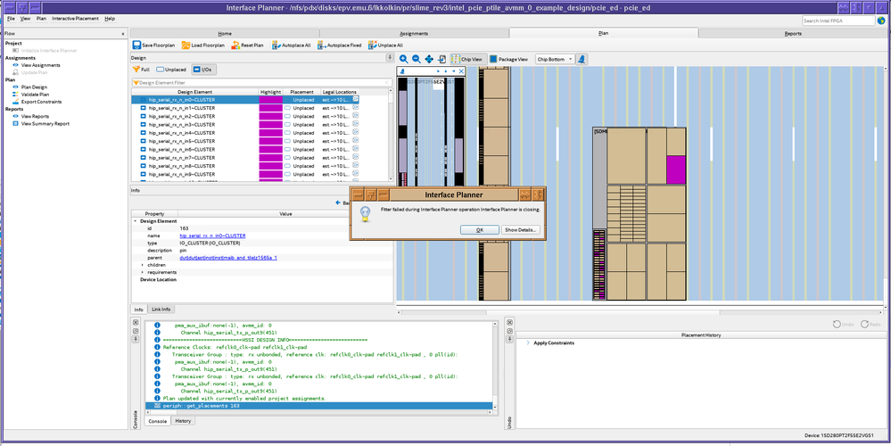I know this is old but I'm still seeing issues with interface planner in Quartus 22.3 crash when trying to place serdes/GXB. This is on any Stratix 10 design. I've cut and pasted debug info below but I'm going to hazard a guess that gui windows only really work in Microsoft window and it struggles with Linux based systems for something in the planner.