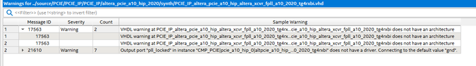 This is caused by Quartus failing to identify the architecture in the generated file "PCIE_IP_altera_pcie_a10_hip_altera_xcvr_fpll_a10_2020_tg4rxbi.vhd". The warning messages are -