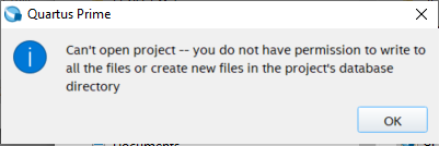 "Can't open project -- you do not have permission to write to all the files or create new files in the project's database directory"