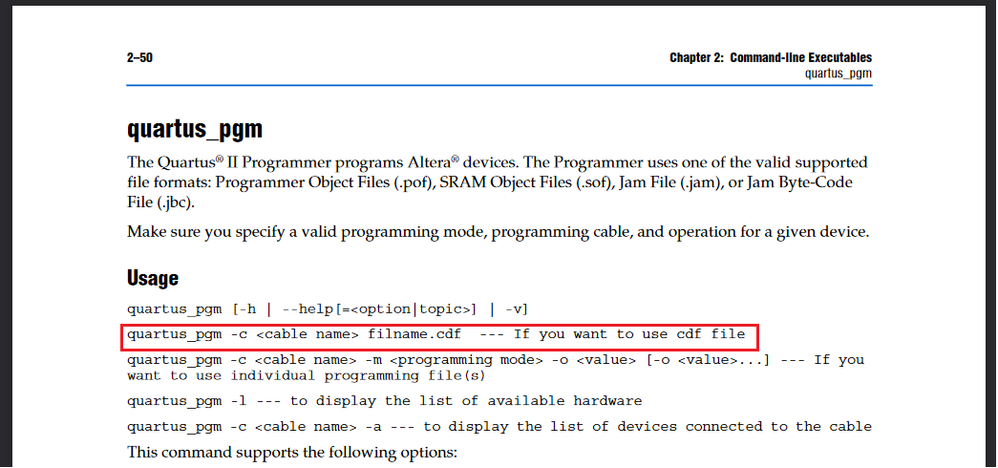 I want to use the quartus_pgm command with a chain description file (.cdf) as per this line in the scripting manual you attached: