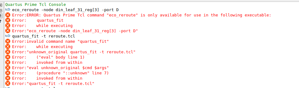 I tried eco_reroute command is it says it's only available with quartus_fit command. Does this mean do I need to put "eco_reroute" command inside some tcl script (like reroute.tcl) and then run it in the command line with "quartus_fit -t reroute.tcl"? Then, what's the use of Tcl console? - Nurina