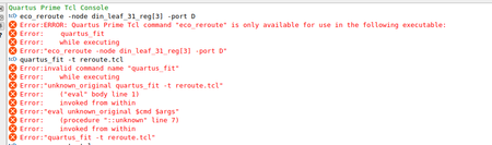 dj-parkOccasional Contributor2 years agoquartus tcl console, how to use? I want to give a quick try on some tcl command and it raises an error like below. Can anyone give me some example of how to use tcl console on quartus prime pro? Show More