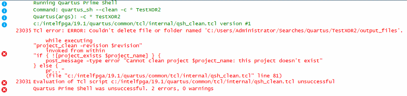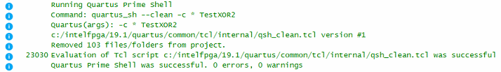 Quartus 19.1 was just installed on a Win10 PC. I made a simple example modelling an XOR gate with a DE0-CV board. I noticed that after a full build, the project>>clean command works fine,