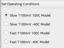 Generally speaking, the slow timing model (what’s the slowest my design will run on the slowest device that met the speed grade, at the lowest voltage in spec and the highest temperature in spec) and the fast timing model(what’s the fastest my design will run on the fastest device, highest voltage and lowest temperature).