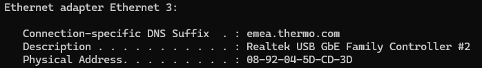 which I also think are correct. PC name and relevant MAC address appear below. I realized yesterday that the MAC address corresponds to the ethernet adapter of my dock, that is, when my laptop is not connected to the dock, I don't see this ethernet adapter. Anyway i don't think this is a problem, because when running these tests I am always connected to the dock, so the relevant ethernet adapter is always present as can be seen in ipconfig /all command output below.
