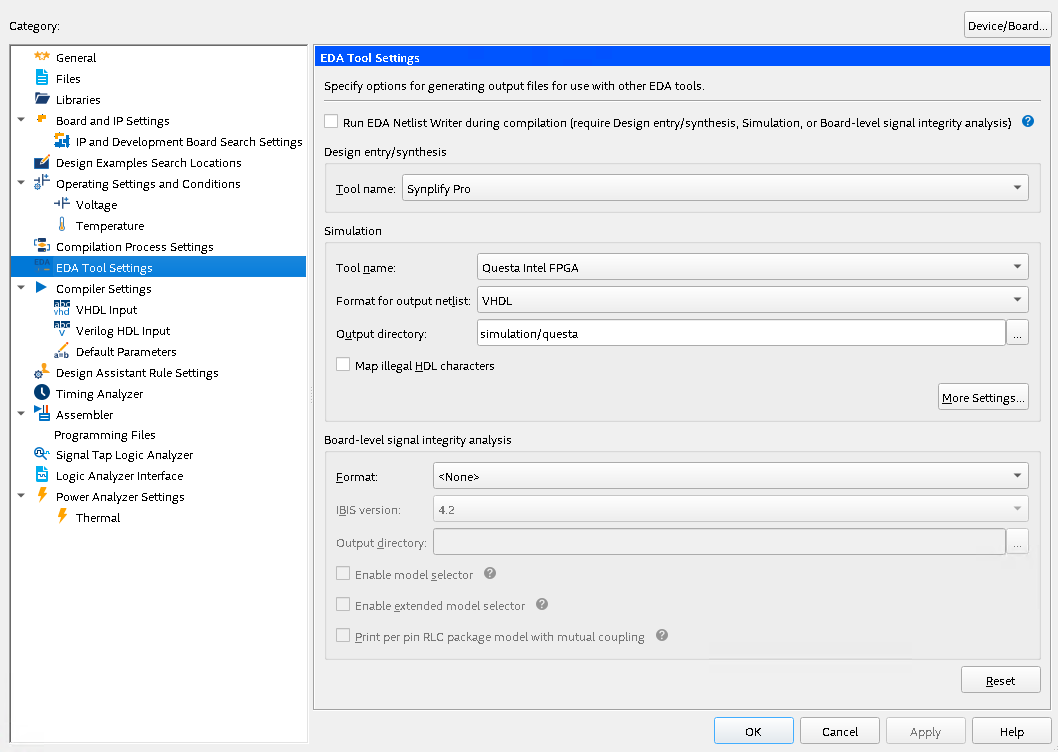 I have also configured Questa in the EDA tools configuration as shown in the image (tool_settings.png). Also seen in the docs that previous version of the tools had a "simulation" option where you can assign a test-bench file, but as can be seen in the screenshot, Quartus no longer have this option.