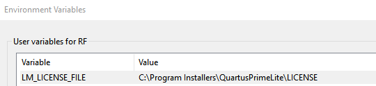 Oh, sorry. A fully qualified filename means the full path to the subdirectory plus the filename itself. You have it how I had it, with only the path to the containing folder. Instead you need something like C:\Program Installers\QuartusPrimeLite\LICENSE\licensefile.dat.