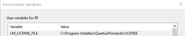 Hey RFI, I finally got it working! Before I only had the path to the subdirectory for my LM_LICENSE_FILE. I changed that to be the fully qualified filename of the license file. It still didn't work with the change to only the System environment variable, but after I modified the User one too, BOOM! Success!