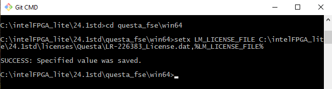 I just installed Quartus lite 24.1 along with questa_fse on a windows 10 computer and generated a license on altera.com, installed the license.dat file in a known location, then updated the LM_LICENSE_FILE environment variable, and followed other online threads, and still get error from questa saying it cant check out a license,
