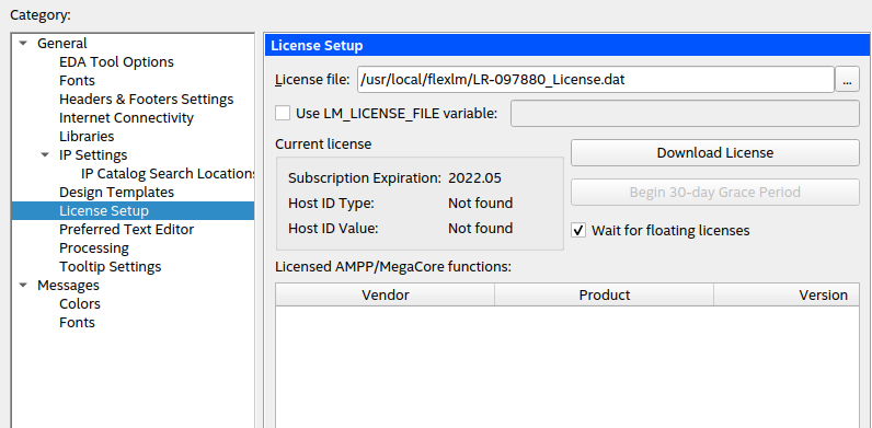 ~/intelFPGA_lite/21.1/questa_fse/linux_x86_64 $ ./vsim Unable to find the license file. It appears that your license file environment variable (e.g., LM_LICENSE_FILE) is not set correctly. Unable to checkout a license. Vsim is closing. ** Error: Invalid license environment. Application closing.