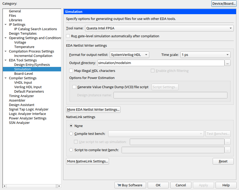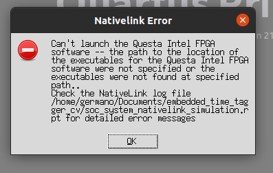 Info: ******************************************************************* Info: Running Quartus Prime Shell Info: Version 21.1.1 Build 850 06/23/2022 SJ Lite Edition Info: Copyright (C) 2022 Intel Corporation. All rights reserved. Info: Your use of Intel Corporation's design tools, logic functions Info: and other software and tools, and any partner logic Info: functions, and any output files from any of the foregoing Info: (including device programming or simulation files), and any Info: associated documentation or information are expressly subject Info: to the terms and conditions of the Intel Program License Info: Subscription Agreement, the Intel Quartus Prime License Agreement, Info: the Intel FPGA IP License Agreement, or other applicable license Info: agreement, including, without limitation, that your use is for Info: the sole purpose of programming logic devices manufactured by Info: Intel and sold by Intel or its authorized distributors. Please Info: refer to the applicable agreement for further details, at Info: https://fpgasoftware.intel.com/eula. Info: Processing started: Tue Oct 18 11:33:01 2022 Info: Command: quartus_sh -t /home/germano/intelFPGA_lite/21.1/quartus/common/tcl/internal/nativelink/qnativesim.tcl --rtl_sim soc_system soc_system Info: Quartus(args): --rtl_sim soc_system soc_system Info: Info: Start Nativelink Simulation process Info: Info: Starting NativeLink simulation with Questa Intel FPGA software Error: Error: Can't launch the Questa Intel FPGA software -- the path to the location of the executables for the Questa Intel FPGA software were not specified or the executables were not found at specified path. Error: Error: You can specify the path in the EDA Tool Options page of the Options dialog box or using the Tcl command set_user_option. Error: Error: NativeLink simulation flow was NOT successful Info: Info: For messages from NativeLink scripts, check the file /home/germano/Documents/embedded_time_tagger_cv/soc_system_nativelink_simulation.rpt File: /home/germano/Documents/embedded_time_tagger_cv/soc_system_nativelink_simulation.rpt Line: 0 Error (23031): Evaluation of Tcl script /home/germano/intelFPGA_lite/21.1/quartus/common/tcl/internal/nativelink/qnativesim.tcl unsuccessful Error: Quartus Prime Shell was unsuccessful. 4 errors, 0 warnings Error: Peak virtual memory: 586 megabytes Error: Processing ended: Tue Oct 18 11:33:05 2022 Error: Elapsed time: 00:00:04 Error: Total CPU time (on all processors): 00:00:02