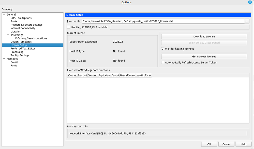 export LM_LICENSE_FILE=/home/username/intelFPGA_standard/24.1std/questa_fse/lr-228096_license.dat