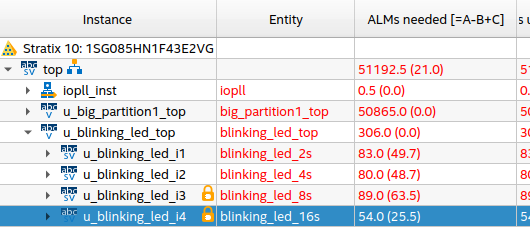 I think this is still too slow because u_bliking_led_i3 and u_bliking_led_i4 are toal less than 200 ALMs.