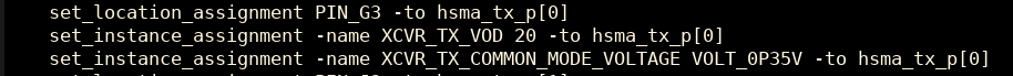 This error occurs during FIT so the QSF parser thought the command was OK. I did try a value found for the XCVR_RX_COMMON_MODE_VOLTAGE which was VTT_0P35V and the QSF parser said it was illegal.