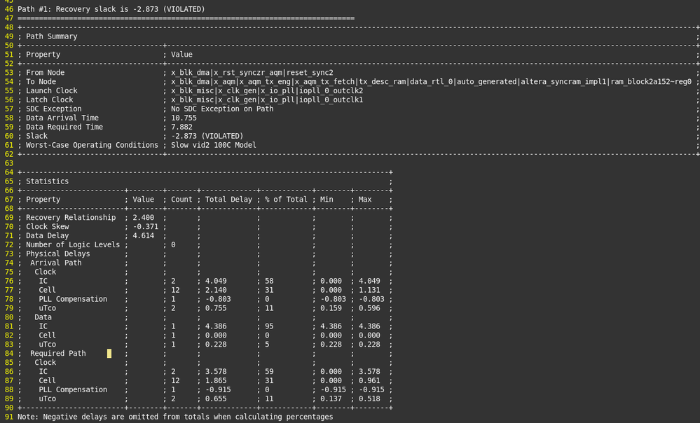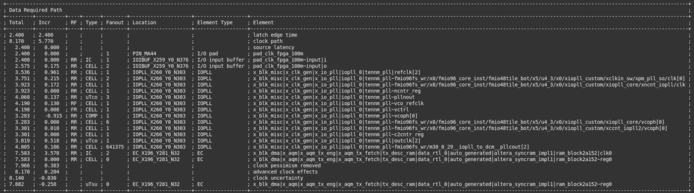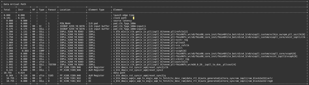 here, the path from start point pll to clk port of reset_sync flop spans nearly the fabric fpga, but the actual routing delay is only 4.04ns.