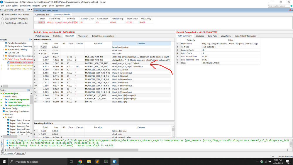 I'm trying to optimize a part of my design to meet my timing goal (150 MHz ~6.66ns path) but one register is not being read as a register on my timing analysis and I don't know why. In the timing analyzer it shows the register cell as a logical cell in the middle of the path, however, since it is a register, it should be at the end of the path.
