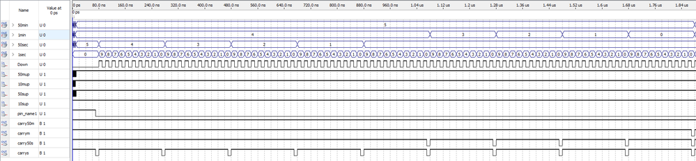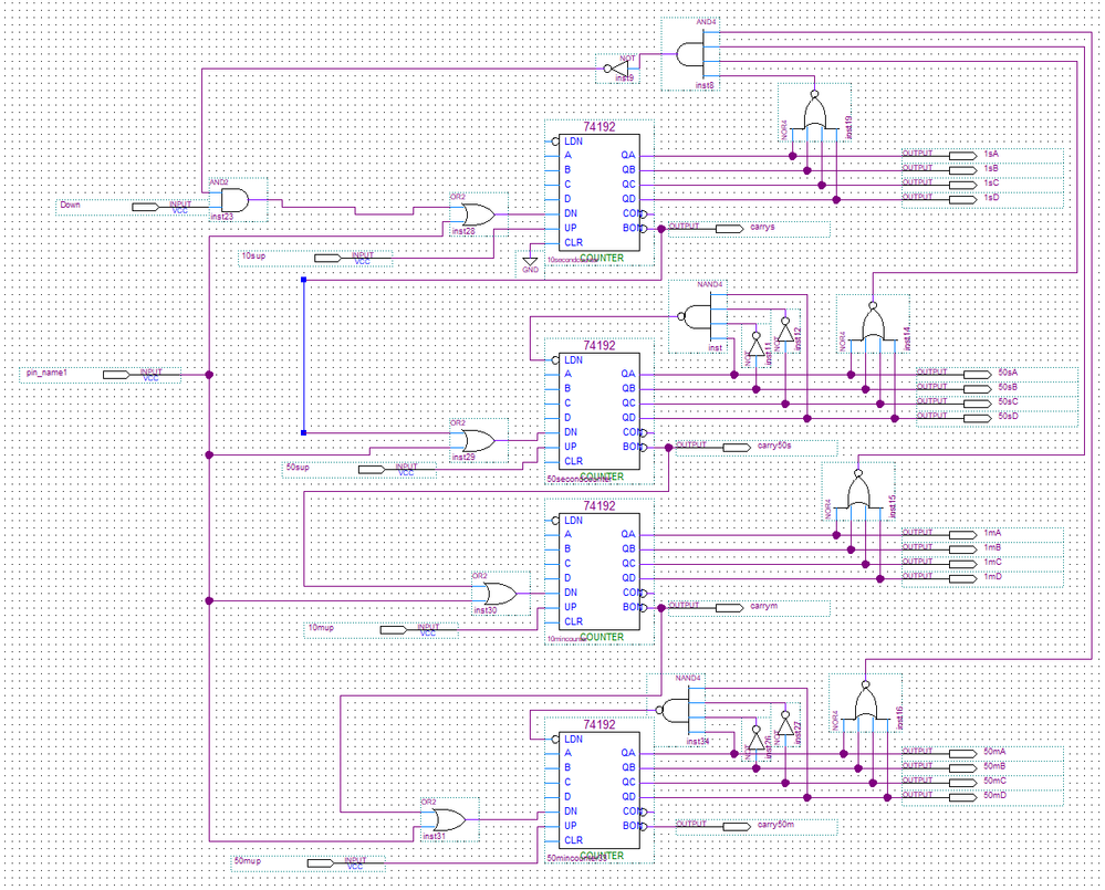 I would like to start by saying I know this is Quartus 2 not Prime because my college uses 2. I did not see a form for 2 but need some help. we are basically restricted to using 74192 for the countdown timer. Everything in the circuit works fine except for the 50-second counter counting from 50 to 10 seconds in conjunction with the timer counting from 9 to 1.