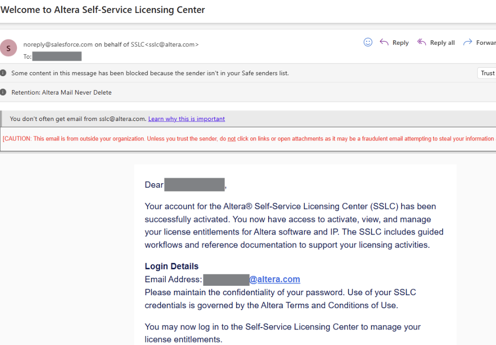 Additionally, you will receive an email below from sslc@altera.com after you register a SSLC account. This email inform you that your account has been successfully activated.