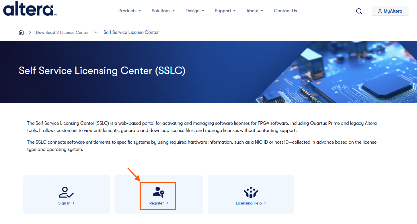 You have to register an account for the SSLC first.MyAltera was supposed to allow access to all things. Unfortunately, this change didn’t get in before SSLC launched, so SSLC has a different signup from myAltera.