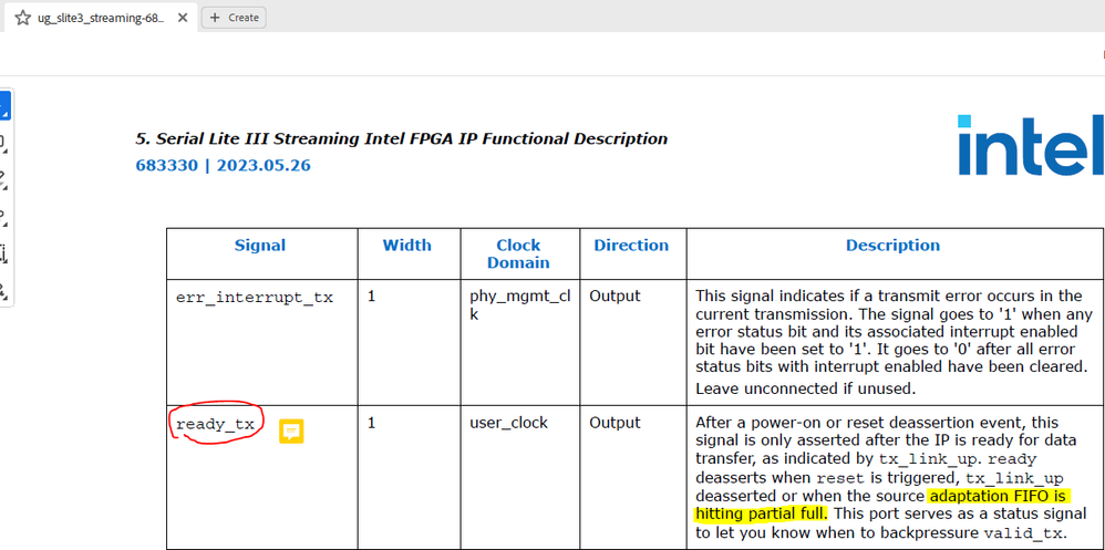 The user guide for the Serial Lite III IP defines a ready_tx signal as follows: