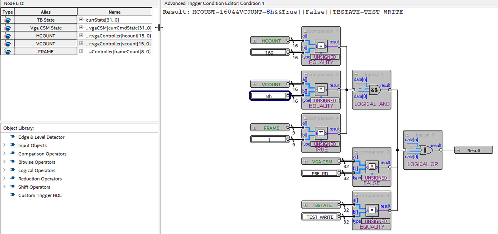 I can't get one of my triggers to work in SignalTap. The HCOUNT equality comparison works fine but the VCOUNT equality comparison will not match a bus value of 8!
