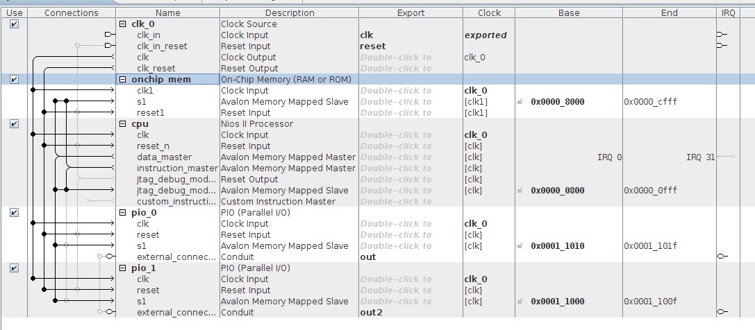I am trying to simulate a very simple NIOS2 design using a custom testbench. The NIOS2 simply sets a PIO pin, but I am not able to see this in the simulation waveforms. First off, I have followed the (quite helpful) simulation tutorial from (http://www.ovro.caltech.edu/~dwh/correlator/pdf/altera_jtag_to_avalon_mm_tutorial.pdf), but I'm still having trouble. It's probably something very simple, but I can't figure out what the issue is. Details are below: qsys system- A picture is attached. But basically it includes: