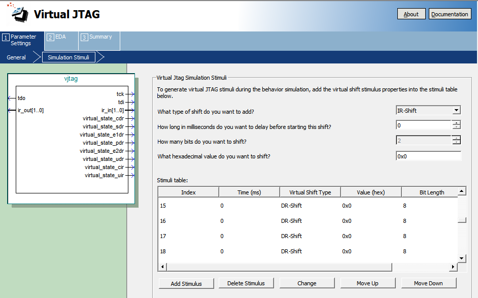 I want to simulate the Virtual JTAG IP Core, and I've already inputted several simulation stimuli that I'd like to test in the IP Parameter Editor: