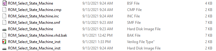 I'm doing the design via schematic entry and have selected VHDL file generation at every step when prompted. However, one of the state machine files that was generated (ROM_Select_State_Machine_inst) is listed in my file folder as a "Verilog File Type" even though I was never asked to select the type. Could this be causing an issue? If so, how can this be corrected?