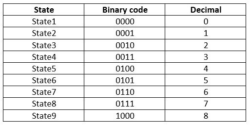 parameter State1=0,State2=1,State3=2,State4=3,State5=4,State6=5,State7=6,State8=7,State9=8;The registers are 9 bits whereas the states only require 4 bits because they are binary encoded: