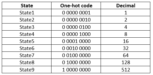 It seems as if the registers are expecting one-hot encoding (9 bits for 9 states):