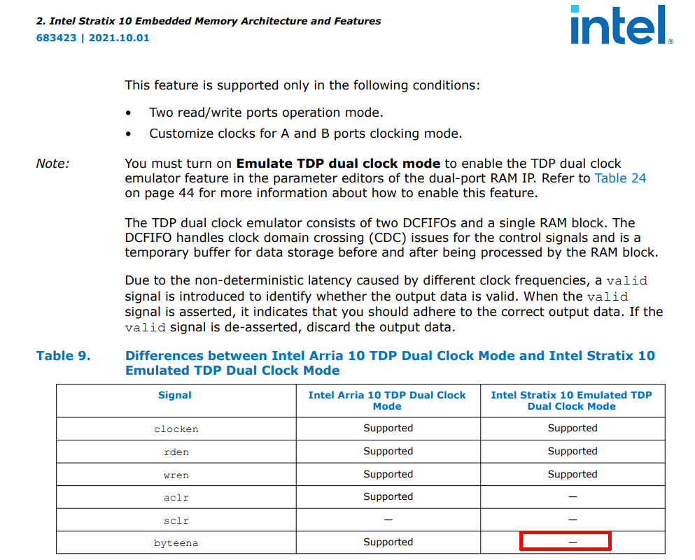 I believe that the fundamental limitation you're running into is that the Stratix 10 M20K block RAM does not physically support true dual port ("TDP") operation with independent clocks. That's even without byte enables.