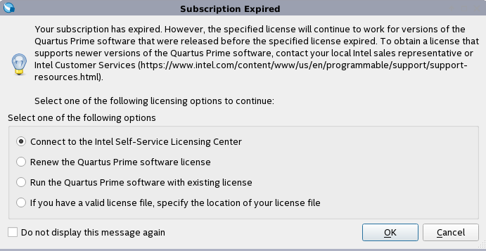 Currently we are running Quartus Prime Version 22.1.0 Build 174 03/30/2022 SC Pro Edition, which doesn't have the pop up, but when we run Quartus Prime Version 21.1.0 Build 842 10/21/2021 Standard Edition, it pops up saying the subscription has expired. The License server FLEXlm is v11.18.2 and so is alterad.