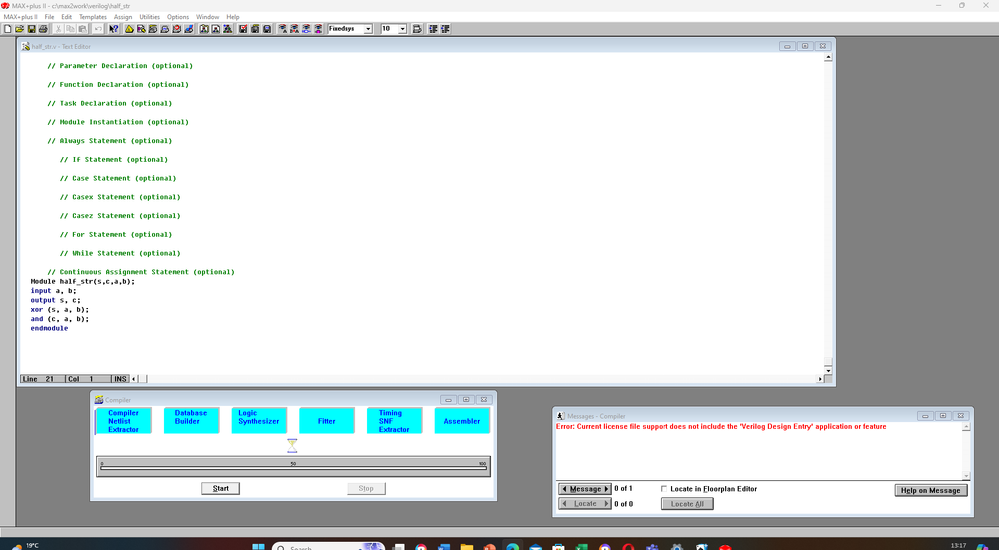 Just as part of investigating this MAX+PLUS II License, I have tried a short Verilog programme, and unfortunately the results are the same: "These Licenses pulled down from the "License Portal" seem NOT to work as shown in the attached. So, please, help, anybody !!!!!!!