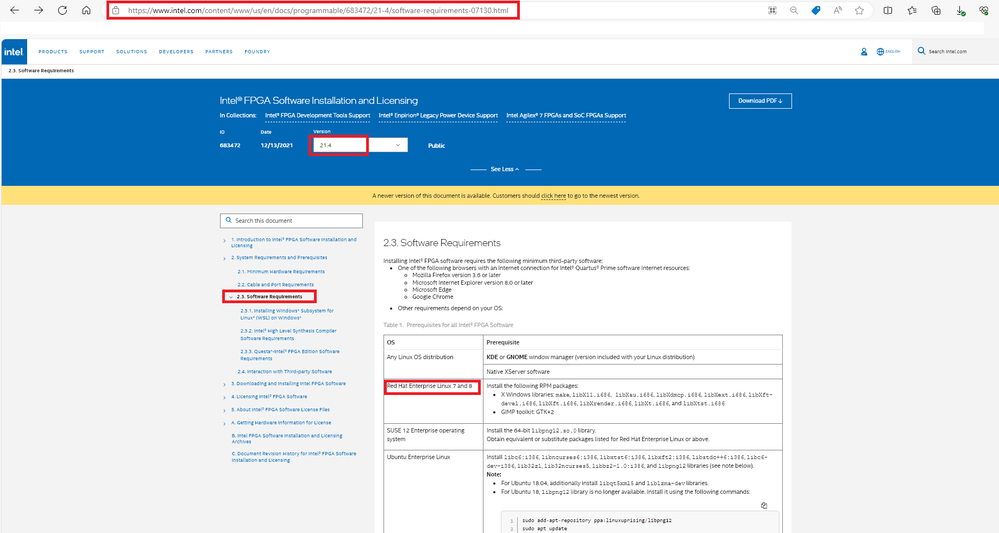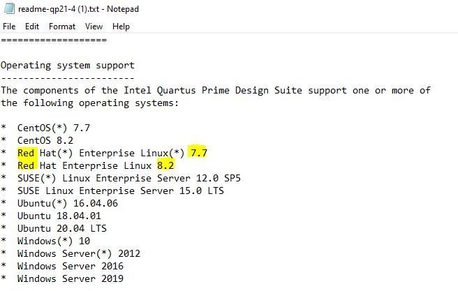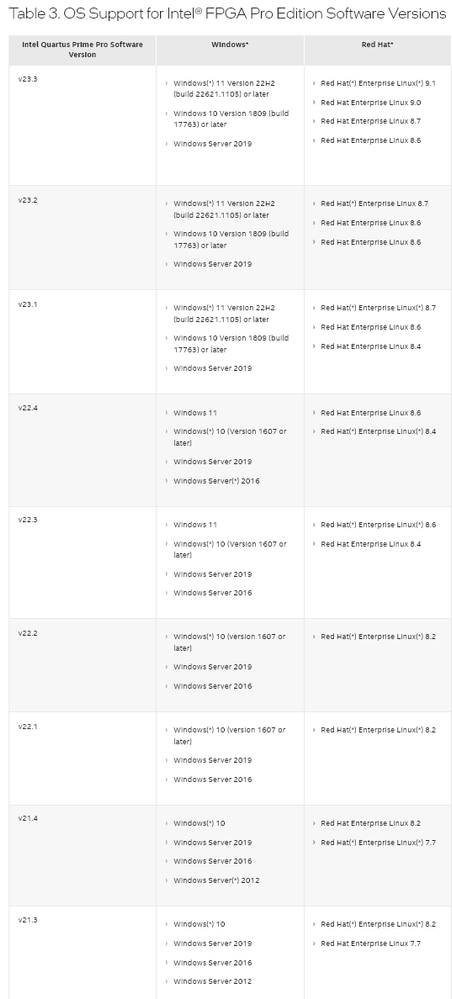 I am trying to work out the supported versions of RHEL for various versions of Quartus prime as we are using version 20.4, 21.1,21.3,21.4 and 22.x on RHEL 7.7 and now we want to upgrade the underlying OS from RHEL 7.7 to RHEL 8.7 but according to Software Operating System (OS) Support Information | Intel Table 3, the supported version listed for RHEL 8 is RHEL8.2 only. I have attached a snapshot from the same page.