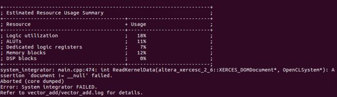 I'm currently following the beginner's guide for intel FPGA on linux host (https://www.youtube.com/watch?v=npeuaj-mfvy&t=2s) but I'm stuck during the compilation process of the device with a corre dumped. The command is :aoc device/vector_add.cl -o bin/vector_add.aocx --report --board c5soc_sharedonly Here's the problem : http://www.alteraforum.com/forum/attachment.php?attachmentid=13170&stc=1 The log file shows the same thing. Have you got any clue on how to solve this problem ? Thanks.