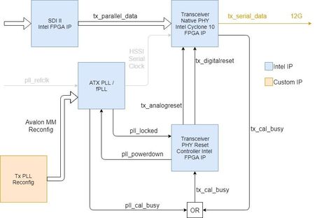Hello, we’re facing the following problem. We’re developing the project with SDI 12G output signal on base Cyclone 10 GX FPGA. We use the Intel IP for SDI protocol, Transceiver PHY and Tx PLL. He...