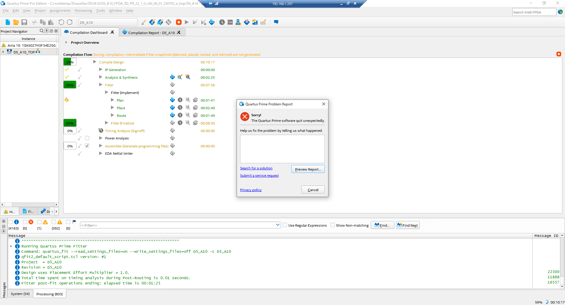 I got Quartus prime Problem report during compilation - I got pop up message and then the Quartus stuck